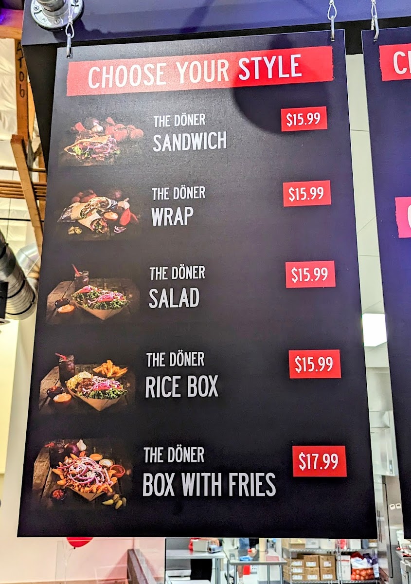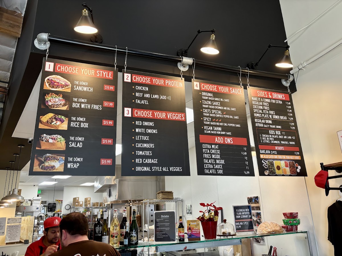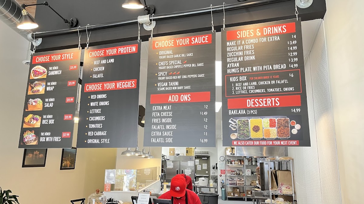 Combo with loaded fries, option of Döner sandwich/wrap/salad/rice box/box with fries. Choose from beef and lamb, chicken, or falafel. Customize veggies and sauce. Includes a variety of drink options.